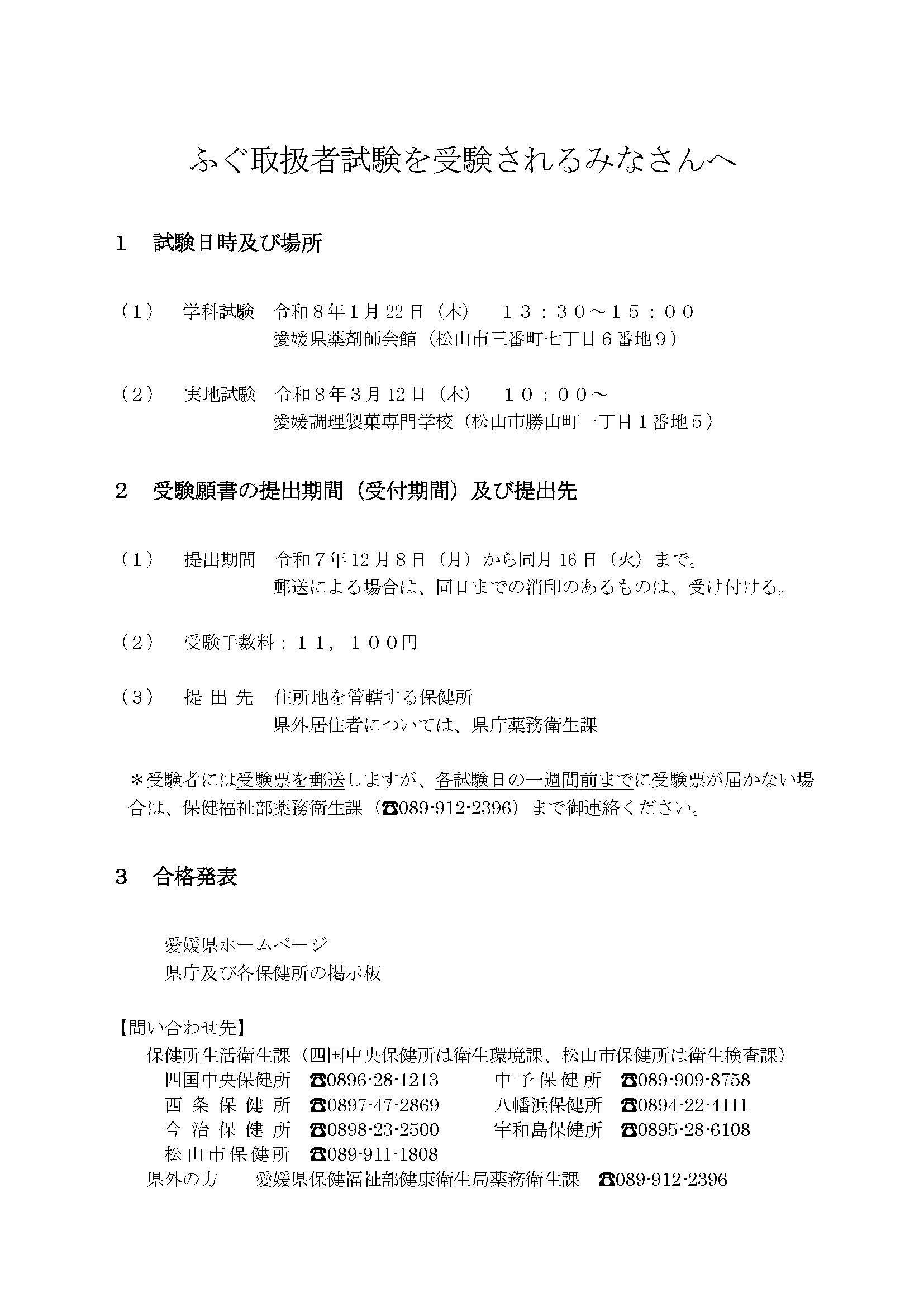 2025年11月3日 / 最終更新日 : 2025年11月3日 masamune 会員の皆様へ重要なお知らせ 愛媛県より今年度のふぐ取扱者試験等についての案内が届きました。 薬務衛生課が所管する試験のご案内 – 愛媛県庁公式ホームページ 【えひめ電子申請システム【申請書ダウンロード】】申請書ダウンロード:申請書ダウンロード詳細 ふぐ取扱者試験を受験されるみなさんへ(PDF)